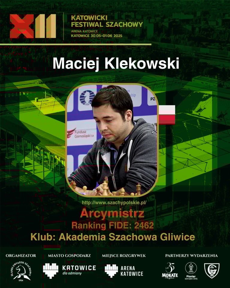 Przedostatni zawodnik naszej serii – GM Maciej Klekowski melduje się na pokładzie! Z dumą prezentujemy kolejnego uczestnika XII Katowickiego Festiwalu Szachowego! Maciej Klekowski to arcymistrz od 2020 roku, reprezentant TS Wisła Kraków, a wcześniej zawodnik Hetmana Częstochowa. Od lat imponuje formą i solidną grą zarówno w szachach klasycznych, jak i błyskawicznych!